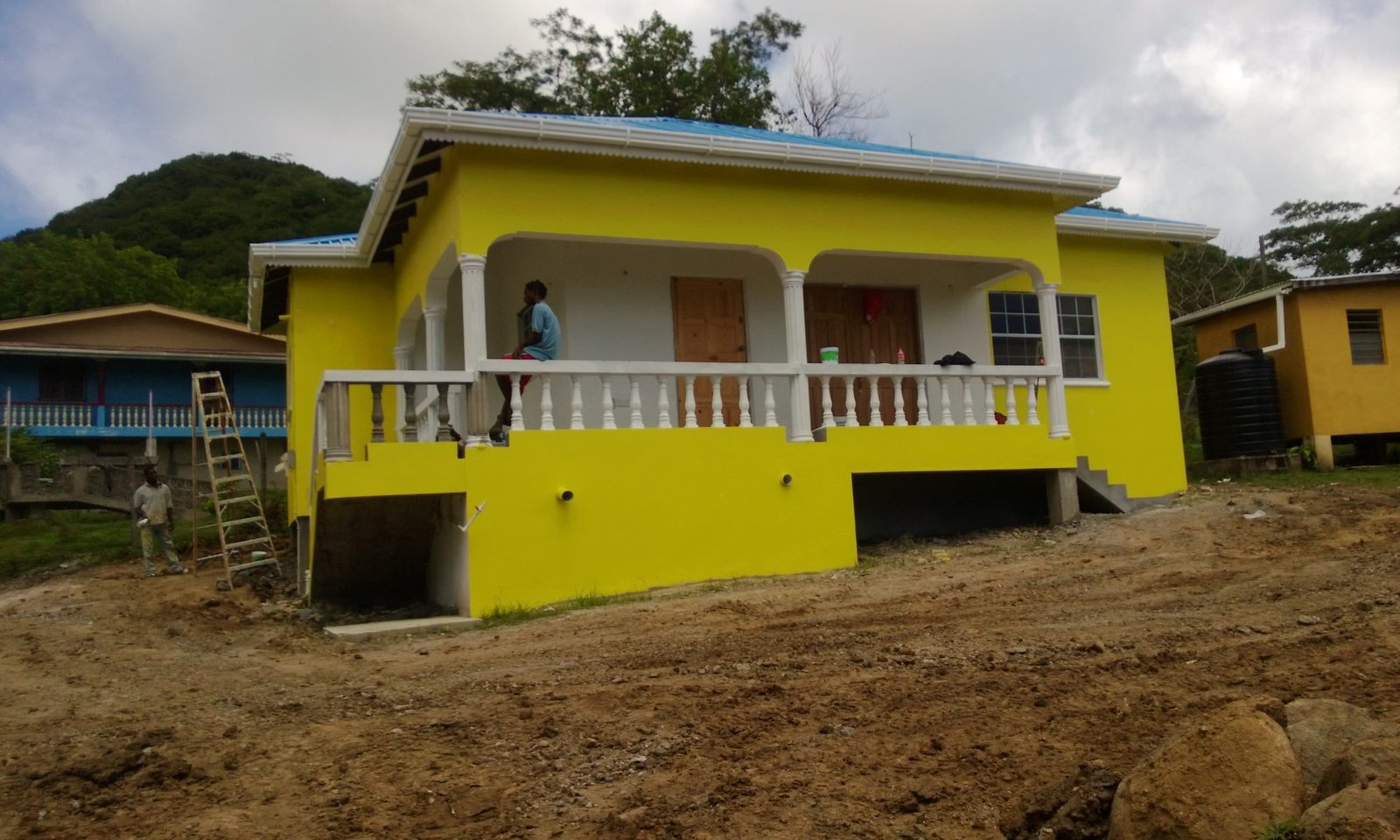 Two bedroom dwelling house constructed at L`Esterre, Carriacou, overlooking the famous paradise beach. The structure was designed and built by KBCS in 2011. The clients live abroad and desired a “Holiday Home” with spacious bedrooms and living area with a very simple modern kitchen. They selected the colour scheme, an outstanding yellow and a brilliant blue to stand out in our tropical sun shine. Ideally they wanted the home to be identifiable as they fly into the island at the nearby airfield. The project commenced in February 2011 and was completed in June 2011. A crew of approximately 14 men worked tirelessly to ensure the completion.